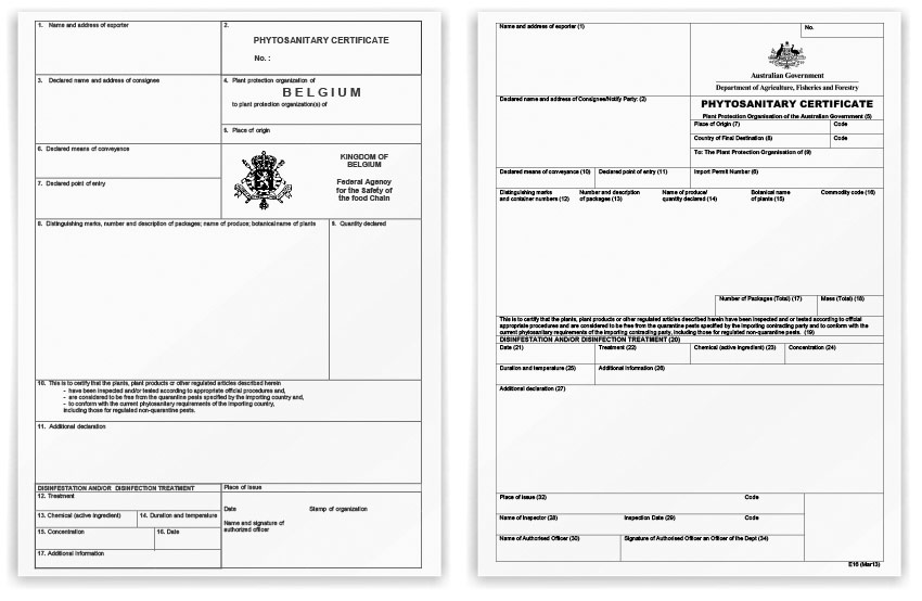 Every country has a slightly different format for their phytosanitary certificates, but as you can see, they are all based on the original model from ISPM 12. These forms have been created according to that country’s preferences and needs. However, all certificates have the same information you see in the ISPM 12 form included within the different document layouts.