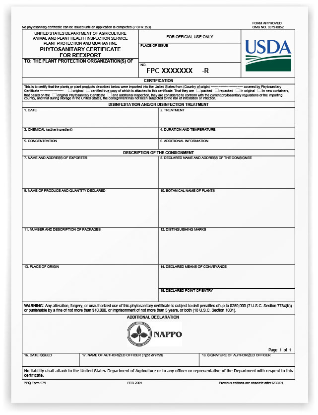 Here is an example of a phytosanitary certificate for re-export issued by the United States (PPQ form 579). This is an example of a manual or paper form and was not generated by the PCIT system. Manually generated PCs must be distributed and records maintained according to PPQ guidelines; this is somewhat time consuming. Distributing the certificate and maintaining the record is done automatically if using the PCIT system.