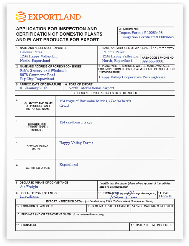 Imagine there is a farmer in Exportland operating multiple barumba berry farms. The farmer would like to export a portion of her crop to Importland. Her name is Paloma Perez, and she has applied to Exportland’s NPPO for certification of her Happy Valley Farms berries that will be exported to Importland.
