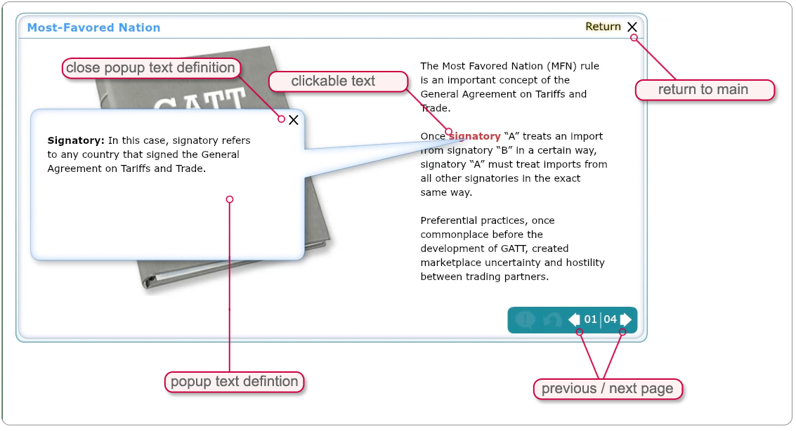 • Definitions: Throughout the Modules you will notice terms that appear in bold, red text. When you hold your mouse over these terms, a popup box will be displayed providing a definition of the term. A complete listing of all the terms and definitions that appear in the module is also provided in the Glossary of Terms, located within the Resources tab.