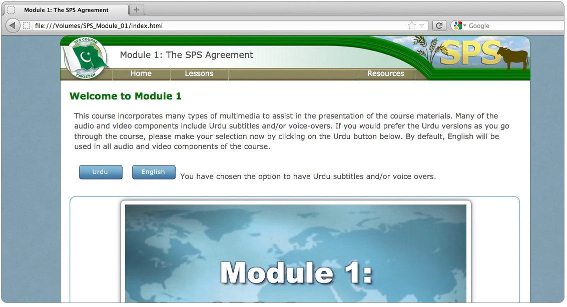 The Modules contain audio-video presentations that are available in English and Urdu. The default setting is English; however, you may change your language setting to Urdu. Make your language selection before beginning the Module, or click Home on the main navigation bar any time to change the language setting.